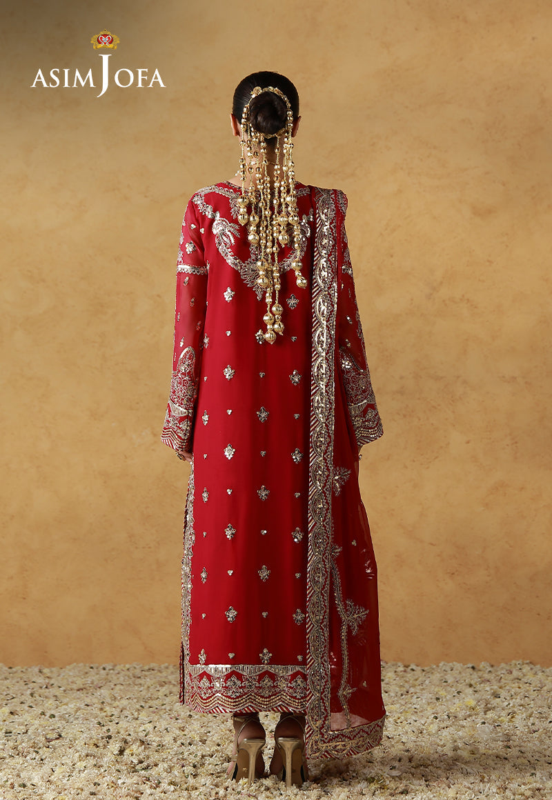 A bold, unapologetic expression of luxury, where dual-metallic textures create a shimmering armor of style. This hot pink ensemble is a tour de force of craftsmanship, featuring a dual-sequin play of 3mm dark gold and 5mm light gold against a backdrop of silverish-gold zari. The lurex woven trousers add a regal, heavy drape to the look, while the dupatta features bold, shiny embroidery that catches the light from every angle. It is a vibrant, high-fashion statement that exudes confidence and wealth.