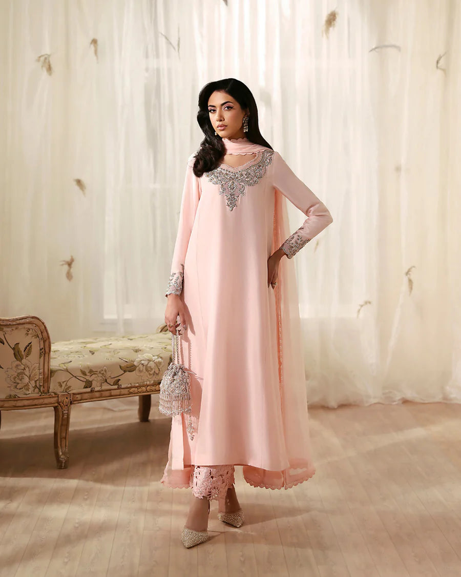 A masterful fusion of intricate embroidery and refined silhouettes, Eleya is truly spectacular. Crafted on blush pink Raw SIlk, the shirt and trouser are richly embellished with dabka, kora and cutdana adornments. Paired with an embroidered chiffon dupatta, this piece showcases opulent details that elevate your presence and help you transition seamlessly from day events to evening soirées.