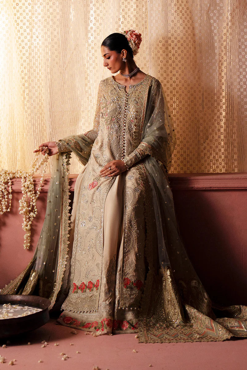 Step into refined elegance with this Whitecap Grey 3-piece pret ensemble, meticulously crafted in Korean Silk and Bareeze Net for a graceful, couture-inspired look. The fully embroidered blouse dazzles with exquisite adda work, while the round neckline with a slit is enhanced by piping, fabric loops, and delicate embroidered buttons for a polished finish. Its fitted sleeves showcase a stunning center motif enriched with adda detailing. The ensemble pairs beautifully with a flared lehenga, adorned with multicolor applique work and intricate embroidered kalliyan, finished with contrast embroidered borders for a vibrant touch. Completing the look is a Bareeze net dupatta, featuring an all-over embroidery jaal and 4-sided borders accented with kiran lace a perfect blend of tradition and modern finesse.